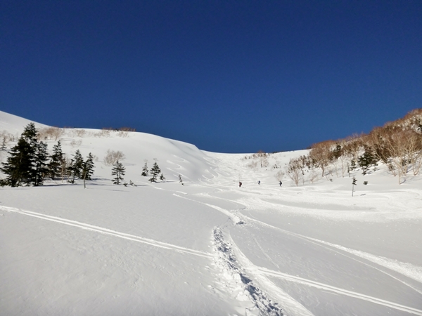 そんなわけで、一応計画上は白馬乗鞍岳だったけど、やめて天狗原までとします。祠のとこで景色眺めて滑る準備します。最初の緩斜面、ここはモナカ化してることが多いけど、意外と軽い雪で気持ちヨシ!とりあえず真ん中の斜面から滑ります。やっぱり詰まった重い雪だけど、板を取られることなく自由に滑れます。