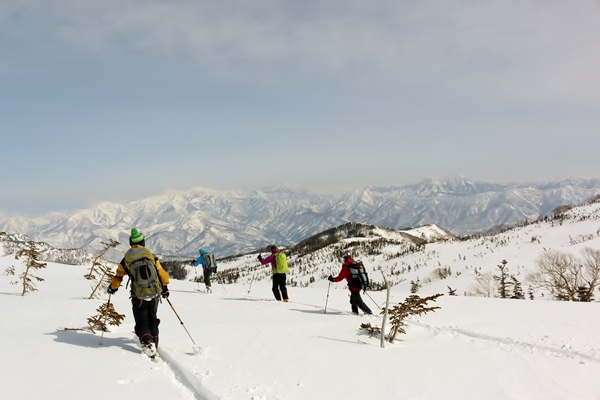 景色を眺めながら歩きたい人は稜線通しで。左に雪倉岳、朝日岳、五輪山、黒負山…と続く真っ白な山並みを見ながらの爽快縦走です。右には頸城の山々。振り返ると白馬乗鞍岳がご立派!難点はフスブリ山とその手前のポコで小さな登り返しがあること。条件良くても、フスブリ山ではシール貼った方が楽そうな感じ。