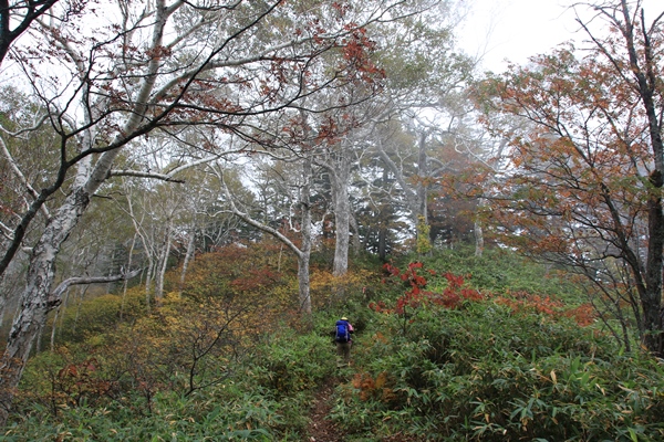 ■雲の上に抜けることを信じて登り始めます夕張岳のいいとこは上の台地。上の台地は約1350mくらいで、登山口が550m。下の800mはひたすら登るだけの道。それでも生えてる木の感じはいいし、道も良いので苦にはならないです。でもでも、相変わらず雲の中。周りの木に黄葉したダケカンバが混じるようになると、冷水コースとの合流です。晴れて日が当たるとキレイそうなのに残念…。 ダケカンバの黄葉は石原平あたりが絶頂。同時に上空の雲の厚みも薄くなり、時々太陽の気配が感じられるように。普通はすぐに雲の上に抜けるのに、今日は抜けそうでなかなか抜けません。山の斜面に沿うように雲があるんかいな…?結局は雲を突き抜けたのは望岳台の直前でした。望岳台で前岳の北側のコルを乗り越すんですが、ここを境に西側はビッシリ雲、東側は晴れ…という状態。ただ、晴れといっても高い雲が全体的にあるため、暗く寂しい感じでした。