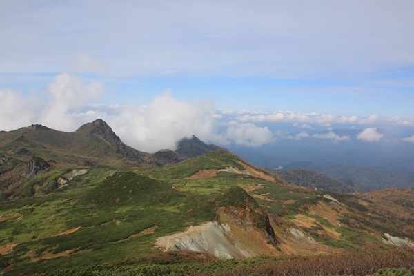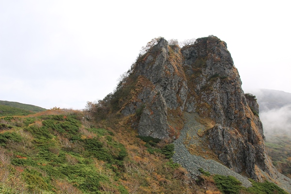 ■望岳台からが夕張岳のいいとこ!望岳台からは北の展望が開けます。雲の間から芦別岳と思われる山も見えていました。望岳台からは前岳の裾を水平に巻いていきます。ひと登りで憩沢の水場です。ここからは夕張岳特有?の台地を進みます。台地の中にニョキニョキと岩峰が生えていて、それを縫いながら登山道が付いてます。夕張岳の山頂はまだまだずっと先。 夕張岳は花の山だけど、お花畑の規模は小さいです。ところどころ湿原になっていたり、蛇紋岩のザレ地になっていたりする程度。お花畑の規模というより、珍しい花が咲くから花の山。お花畑よりも笹原の面積の方がずっと広いです。で、その笹が刈り払われてなくて、かなり登山道に被さってきてます。掻き分け掻き分け進みます。足元はちゃんとあるから、ヤブ漕ぎってほどではないですが…。スッキリしたイメージの夕張岳に、この笹ヤブは似つかわしくないような…。