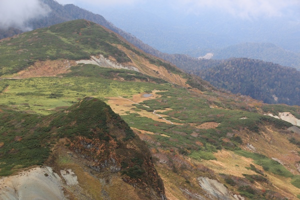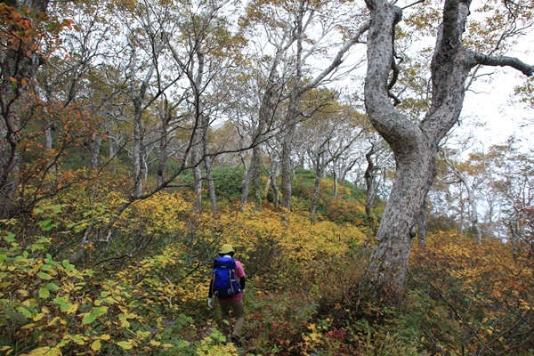 ■夕張岳をあとに下山します夕張岳の紅葉…。1300mより上の開けた台地は既に終了。ナナカマドは終わるの早いですね。もともと紅葉する木も少ないです。笹が多い。見頃の時に来たらどうなのかは不明ですが…。今日に限っては、台地より下のダケカンバが見頃でキレイでした。下りは望岳台までがなかなか高度を落とさないので長いです。朝は雲の中だった石原平のダケカンバ、帰りは晴れてるかなと期待したけど曇り空でした。下山は冷水コース。馬の背も冷水もどちらも道は良かったです。それだけに上の笹が…。 夕張岳への林道に入るとこでは霧雨が降ってて、もしかしたら辞めたかもしれない夕張岳。スカッとは晴れなかったにしても、上は視界があったので登って良かったです。紅葉の夕張岳はイマイチよくわからんかったけど、花の夕張岳にもう一度登ってみたいなあ…と思いました。本日のお客さんは、単独×2と夕張山岳会のみなさま…の3チームでした。