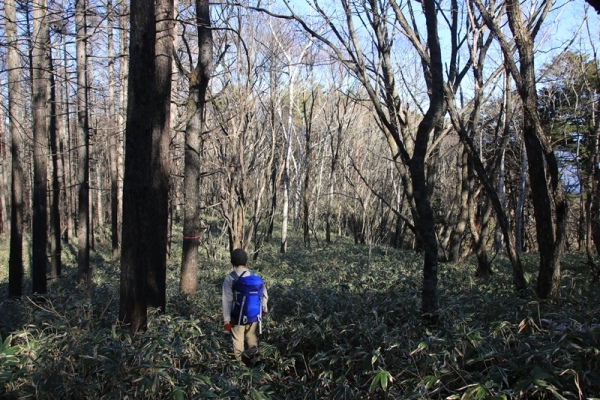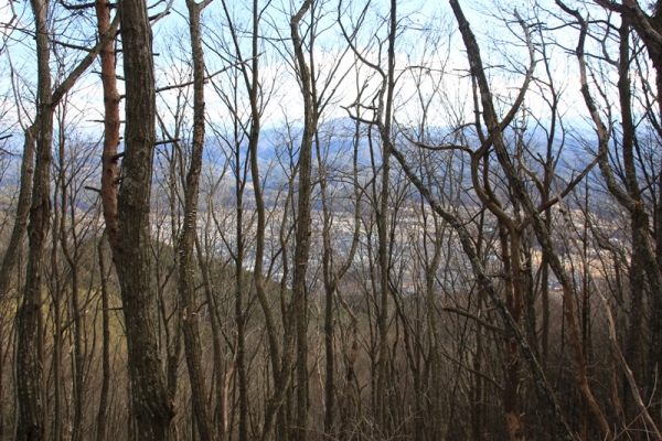 ■楡沢山は全体的にパッとしませんなあ・・・ここから秋葉神のある1116m点までは急な尾根登り。U字に掘れた道に枯れ葉が溜まり、アリ地獄状態でした。フクラハギに堪えます。1116mからは緩くなって楽になるけど、少々ヤブっぽいのが…。道が手入れされている感じはないので、幼木が繁茂している状態です。漕ぐほどのヤブはないんですけど、鬱陶しいような…。 楡沢山の山頂はこんもりとした丘のよう。樹林に囲まれて展望まるでナシ…。よくぞこの山をふるさとの山に推したもんだ…と個人的には思いました。街のすぐ裏手にあって馴染みがあるからかなあ…?それにしても、地元の人が頻繁に登っているようにも思えない。山道も手入れされてないし…。まだ、中央道と国道153号を分ける尾根の末端にある大城山の方がいいんじゃないかと思ったのでした。 枯れ葉の溜まったU字の道、下りは苦労するんじゃないかと想像してました。ところが、グリセードのように下っていけました。登る時に感じる下りの印象と、実際に下る時に感じる印象とは違うことが多いです。とくに急斜面や雪道とかでは。だいたいは登りの時に心配するほど苦労しないです。尾根下りなので、何度も尾根が分れます。最後のへん、踏み跡が不明瞭になると、どっちに降りていいのかわからなくなります。一度間違えかけた…。