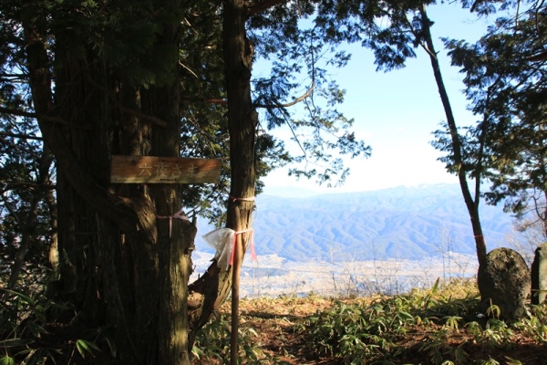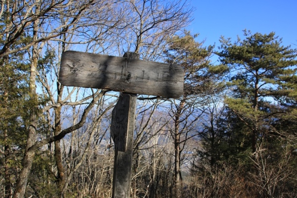 ■先に六夜さまに立ち寄っておきます15分ほどで稜線。この稜線はさっきの楡沢山から桑沢山へと続いております。さらには、経ヶ岳へとつながっています。稜線の分岐に朽ちかけた看板があります。南は桑沢山、北は六夜さま。六夜さまを帰りにすると、多分立ち寄るのが面倒になるだろうな。先に行っておこう。どこが六夜さまの位置がどこだかも知らずに向かいます。すると、ひと登りでアッサリ到着。 六夜さまは稜線の北にすぐの1454mピークです。ピークは東に開けていて、というか伐採されています。辰野の街と八ヶ岳の展望が良好です。八ヶ岳の雪は高いとこが白くなってるだけ。しかも古そうな雪。霧ヶ峰に至っては雪のかけらも見えません…。せっかくなので北や西の木も切って欲しいなあ。