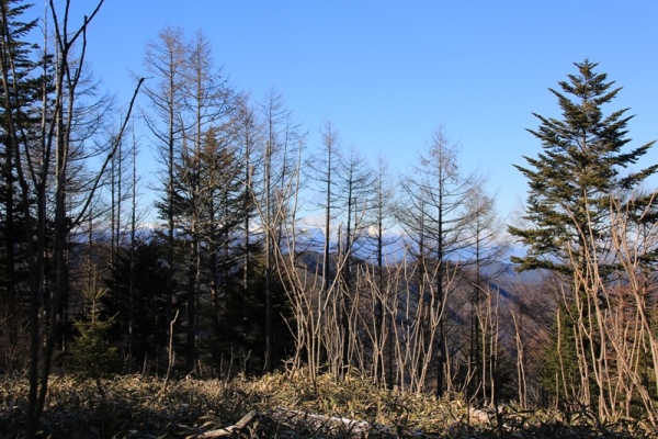 ■桑沢山は楡沢山よりはマシでした・・・稜線はカラマツが主体で、林床には笹が生えています。よくある感じですかね。嫌いじゃない雰囲気です。桑沢山までは緩いアップダウンを何度か繰り返します。2つ目のピークだったか、狭い範囲だけど木が薄くなってる箇所があり、木の隙間から真っ白な北アルプスが…。ガバッと見えたらキレイそうなのに…。 桑沢山の山頂は楡沢山より狭いです。ここも樹林に覆われているんですが、東側の木が薄くなったところから南アルプスが覗き見できました。仙丈ヶ岳を見ようとすると甲斐駒が隠れ、甲斐駒を見ようとすると仙丈ヶ岳は隠れる…。まあ、少しでも見えてくれればね。全く見えないのとは雲泥の差であります。 桑沢山は地味な山ですが、楡沢山に比べると六夜さまと山頂で展望が少しありました。歩く林の雰囲気も桑沢山の方がずっと良かったです。あくまでも楡沢山と比べてのお話です。足して一人前ってとこですかね。信州ふるさと山が2つクリアできたのが最大の収穫であります。