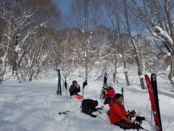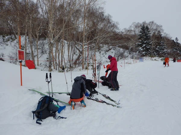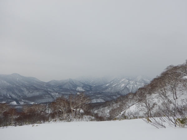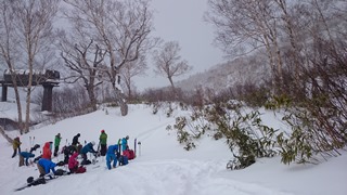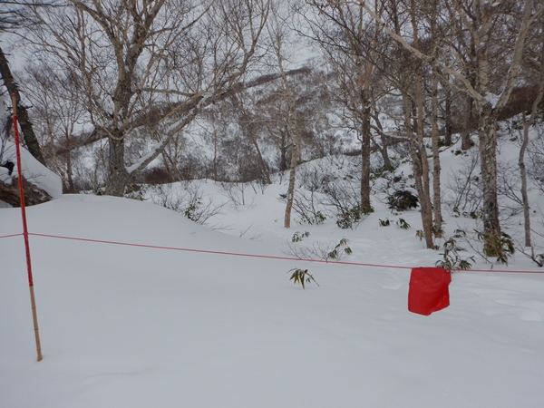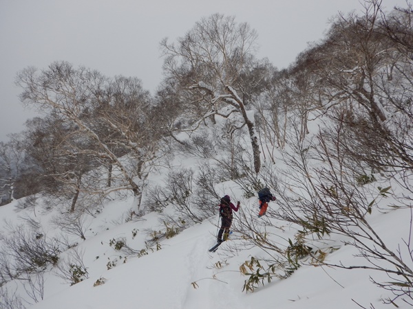 ■さて滑りますが、滑る斜面のブッシュは如何に・・・?天気も良くないし、風も少しあるし、稜線まで登っても妙高本体見えないだろうし…ということで、稜線のすぐ下で登り終了とします。とりあえず、このカンバの疎林斜面は疎林です。ブッシュも少なめ。本日唯一の快適斜面の可能性大なので、悔いのないように滑りましょう!とは言っても、滑ってみたら、やっぱりブッシュはあるし段差はあるしで、雪不足は否めない感がありましたね。雪は底アリの軽いパウダーで、万人に優しい雪でした。 今日は池ノ峰へと続く尾根を辿ることとします。。ひとつ東側だと、最後の雪原に降りるとこが急斜面で、そこがベリベリブッシュだと降りるの大変かと思って…。まあまあ快適に滑れたのは2本分だけ。そのあとは薮をかいくぐりながら滑ります。時々濃密ブッシュに進路を阻まれることも。救いは雪が軽くて滑りやすかったこと。これで雪が悪かったらお手上げでございました。 いつもなら鬱陶しい中間部の針葉樹林帯。今日はオアシスのようでした。針葉樹の間はブッシュが少ないもんで…。おまけに雪が良いのでスイスイと!ただ、針葉樹林帯を抜けると、ヤブの濃密度が1ランクアップ!大股広げボーゲン多用。最後に雪原に降りるブナの斜面は、思いのほかブッシュが少なく、本日2番目の快適斜面となっておりました。終わりよければ全てヨシ!とはよく言ったもんで…。雪原に降りてからは、前日のトレースに乗って楽します。トレースなくても新雪は浅いので、それほど苦にはならない感じでした。天気が悪化する前に無事下山であります!山は無事だったけど、ゲレンデで降りるとこ間違えてもーた…。