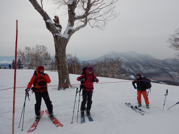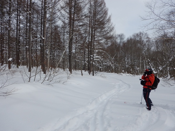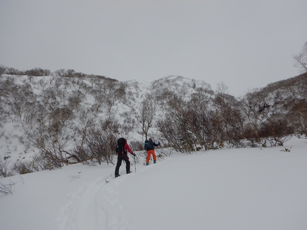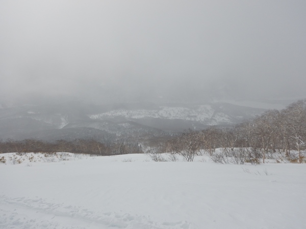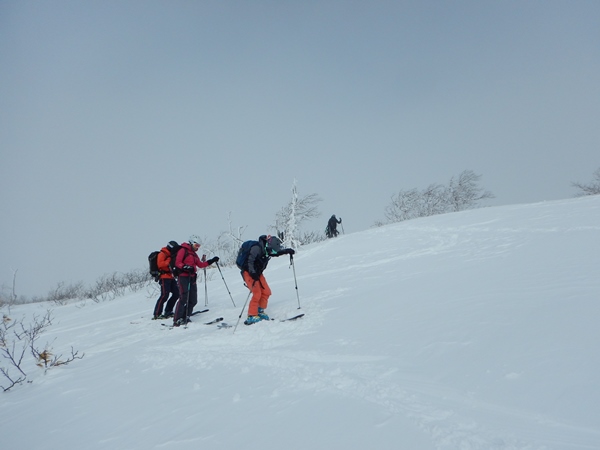 ■登る斜面もまだまだブッシュの勢いが・・・高曇りだった空だけど、みるみる山の高さに雲が増殖。西の方の山は早くから雲の中に納まり、遠くの山々もだんだんと見えなくなります。そして、滑る時のランドマークにしたい黒姫山や高妻山にもとうとう…。雪があれば大きなジグザグで登っていけるんですが、今日はブッシュを縫って登るため、不規則なトレースになってしまいます。でもまあ、想定内の状況です。 最近は妙高にも外人さんが増えましたね。せっかく日本に来てもらってるのに、今シーズンは雪が少なくて可哀そう…。昨日?は前山に行ってたらしく『maeyama ridge is very very bush!』と言ってたのをまきchinが聞いていました。ワタクシもベリベリブッシュな前山は何度か経験しております。三田原山は稜線下のカンバ疎林は快適に滑れると踏んでの三田原当選です。ブナはヤブ覚悟…