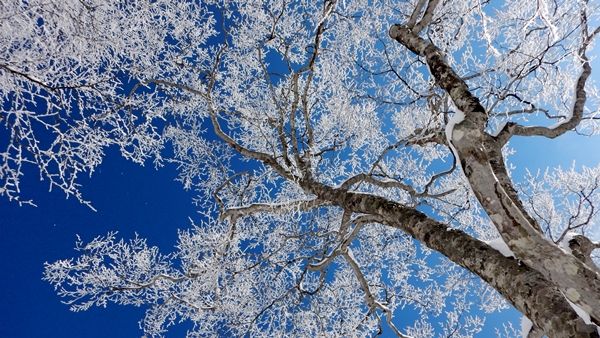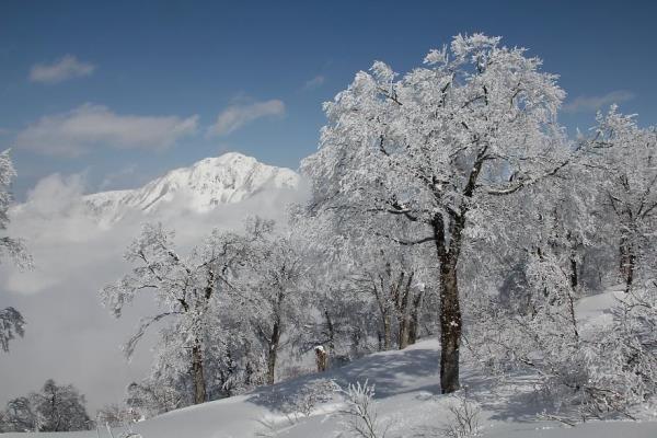 ■いつの間にか晴れてきて樹氷の花が真っ盛り!登りトレースのある台地状に復帰してひと休み。いつの間にか空は真っ青に!雪も天気も悪いでは良いとこナシだけど、天気には何とか恵まれそうです。タラタラと登っていきます。今年のキーワードとなりつつある『薮』ですが、登ることに関しては問題はほぼナシ。滑ることに関しては問題ありそうだけど、滑る時に考えよう! 山頂直下からは樹氷がとってもキレイでした。青空に映えてます!頑張って宴会の翌日に登って来た甲斐がありました。大渚山も鍋倉ほどではないけど、樹氷率は高いです。鍋倉ほどブナは立派ではないけど…。大渚山の中でも、このルート沿いのブナ林は林相イマイチかな。鎌池周辺やタケノコ下の台地のブナは立派です。あそこらへんのブナが樹氷になったら、相当キレイです。