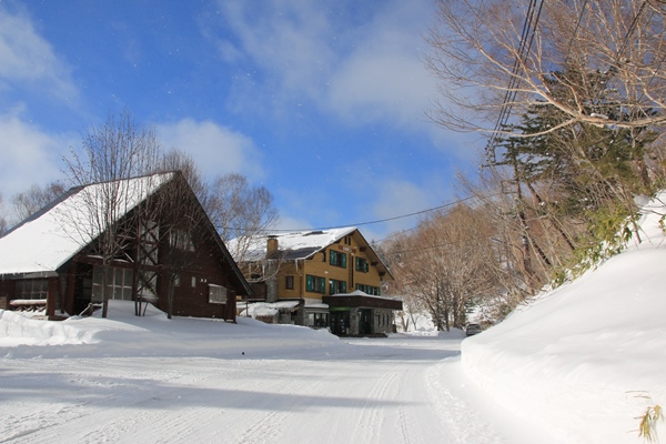 ■万座温泉までがなかなか遠いです万座温泉まで遠いこと。三才山と鳥居峠の雨氷が凄かった!(一番最後に写真あり)スキー場に止めて、リフト1本乗って林道に取り付こうかと思っていました。試しに車道を行けるとこまで行ってみます。除雪の終点あたりは広くなってて、どこでも止めれそうな雰囲気。帰りに気付いたけど、手前3軒目?が公民館ぽい建物で、駐車しやすそうな雰囲気でした。スキー場スタートもアリと思います。少し短縮できるし、最後滑れるし。 弱い冬型ということで、小雪が舞うけど晴れ間もある空模様。山には雲がかかってます。回復傾向の予報なので、このあとに期待!除雪終点の先はすぐにスキー場。林道は迂回コースになってました。しばらくでスキー場から離れます。林道の積雪は風とかでバラつきはあるけど、50センチくらいなもんです。新雪は30cmくらい。せいぜいスネ下なのでラッセルと呼ぶには大げさ。でも、ラッセルナシより消耗はしますね。