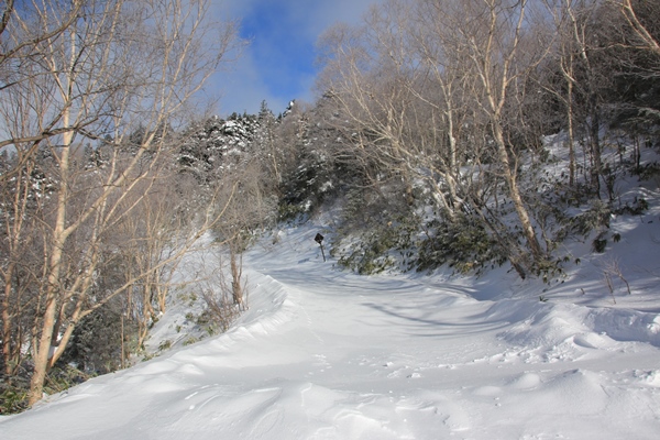 ■御飯岳本体の滑りはちょっとだけど楽しい!さて、本日唯一の滑れる260mの標高差。山頂に近いところは風の影響で薄皮モナカだったけど、すぐに軽い雪に変わります。やや詰まった感じはあったけど、板が走る滑りやすい雪でした。たまに密林になるけど、おおむね適度な樹間があって楽しい斜面。ただ、地形図を見てもわかる通り、やや片斜面気味。左へ左へトラバースしながら滑る感じでした。雪がしっかりあれば谷底まで滑って、林道に登り返すのも面白いかも。あと100m滑れます。どうせ林道でシール着けるし…。 本日の滑りは5分ほどでオシマイ。林道に降りてきました。数えるほどしかターンしてないけど、気持ちよく滑れました。さて、問題の平らな林道。県境が1899m→黒湯沢源頭1838m→万座峠約1830m→スキー場合流約1800m。約5.5キロで100mしか下りません。出だしはほぼ平坦。後にツルツル滑って体力を消耗します。先で下りになって少し滑ったけど、すぐにストップ。しっかりトレースあればまだしも、一人分のトレースではもうひと埋まりします。潔くシール貼りました。後にツルツル滑らないのでシールの方が楽。万座峠の先でやっと傾斜が出るので、そこからシールをはずしてゲレンデまで滑って行けました。