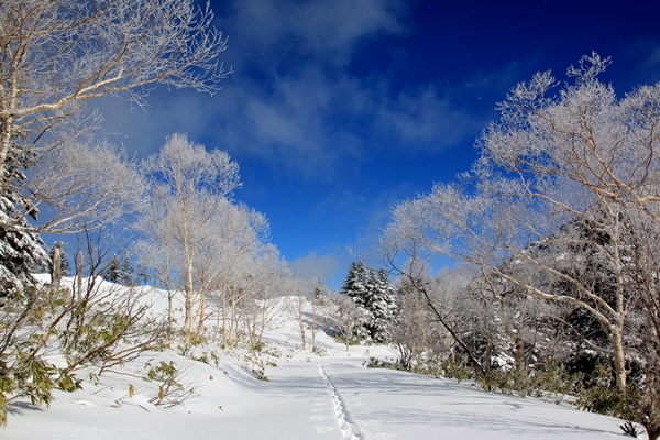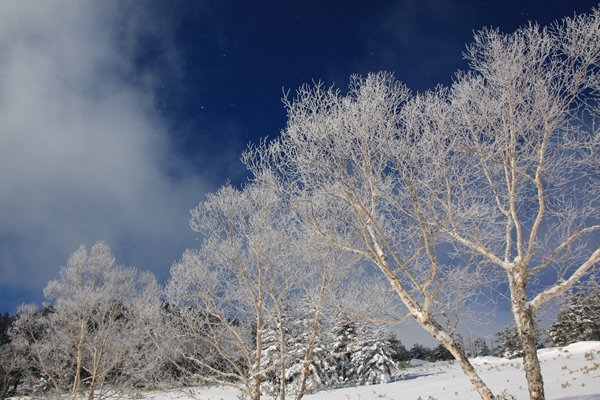 ■長い車道歩きだけど雰囲気良いので気分よく歩けます最初のチェックポイントは万座峠。順調に登っていましたが、峠の手前から平坦に…。帰りは止まるな…。目指す御飯岳は厚い雲の中。見えてる山もある中で、御飯岳のはかなしぶとそうな雲です。四阿山にも手強そうな雲。南の浅間連山は丸見えです。草津白根山や横手山はわりと見える時間がありますね〜。このエリアは冬に来るの初めてなので、弱い冬型時の天気の傾向に興味津々であります。毛無峠からは西側の展望あり。笠ヶ岳が見えました。その他は雲があって見えず…。 林道歩きは退屈なものですが、ここの林道はなかなか気持ち良いです。ダケカンバと針葉樹が混じった明るい林で、雪が着いてるもんだからキレイです。バックが青空になるたびに写真撮ってたような…。ただ、林道に傾斜がない…。一人分のトレースでは滑りが悪いだろうなあ…。そうそう、さっきから林道林道と書いてますが、ここはれっきとした県道であります。気持ちよく歩けてた林道ですが、さすがに後半は飽きてきましたね〜。
