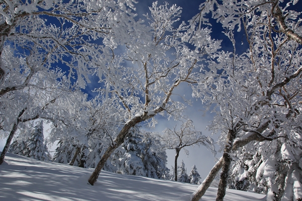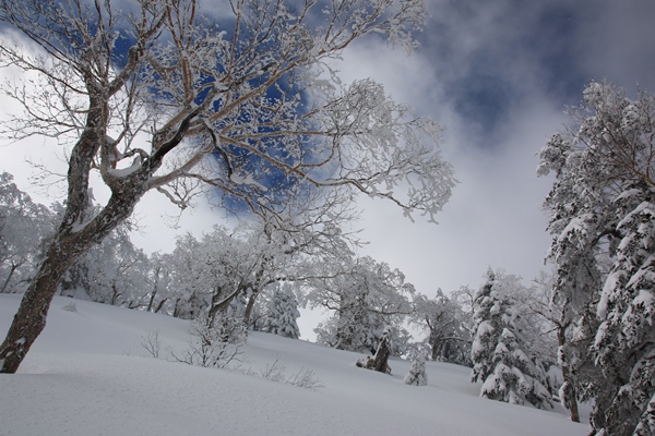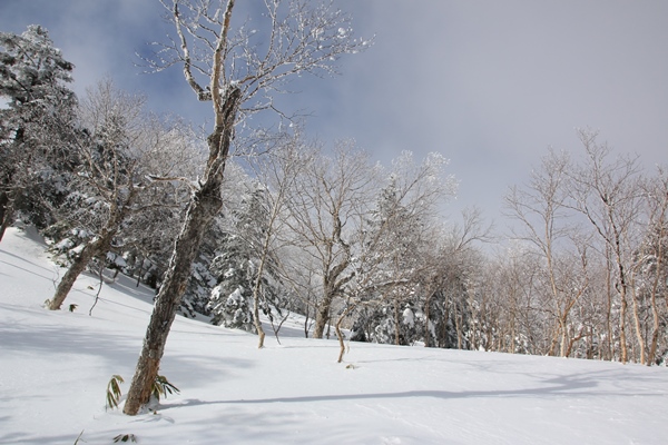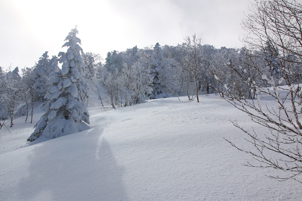 ■御飯岳本体の登りも雰囲気ヨシ!1899mのコルで、林道は稜線の東側から西側へと移ります。ということで、ここが長野、群馬県境。御飯岳へもここから取り付きました。林道を歩いている間ずっと御飯岳は雲の中。登るコース取りを見たかったけど見れず…。歩き易そうなところを、上へ上へと登っていくだけです。御飯岳本体の雪は多いです。北斜面だからなのか、その他の要因があるのか…?しかも軽そうな雪!スキーで登るには、すぐ崩れて登りにくい雪です。林の雰囲気と樹氷がとてもキレイでした。