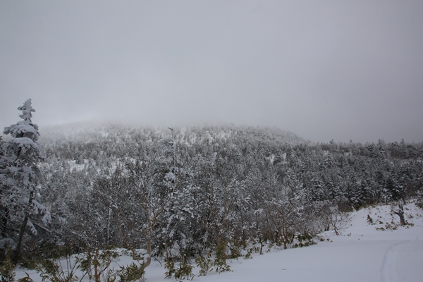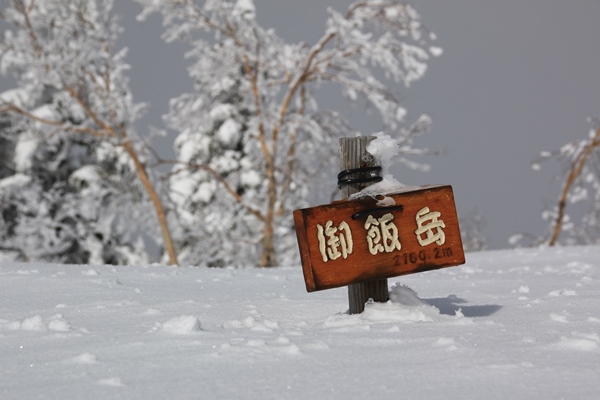 ■御飯岳山頂山頂には何もないかなと思ってたら、ありました…小さな看板が。雪面からギリギリ出てました。雪の上から今刺したような感じで。山頂は針葉樹が中心かな。残念ながら展望はナシ。晴れてれば少しは展望ありそうな感じ?真上の空は時々晴れるけど、ずっと横に雲が出てて、近くの山も全く見えませんでした。それでも心地よい山頂だったので、一人にもかかわらず長居してしまいました。