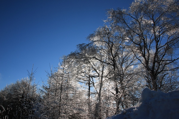 ■雨氷で山全体がキラキラ!(三才山や鳥居峠)前の週に長野県中信地方では雨氷という現象が広範囲でありました。氷点下なのに雨が降って、木に着いた雨が凍ってしまうというもの。上空が寒くないんでしょうね。倒木で車道がふさがれ、美ヶ原や清水高原で観光客が孤立しました。あれから数日経つと言うのに、まだ雨氷は健在でした。三才山トンネル前後と鳥居峠がすごかった!山全体がキラキラでしたから。下の写真は鳥居峠です。