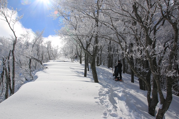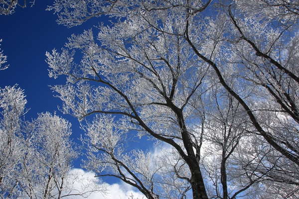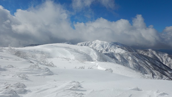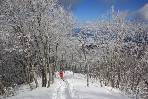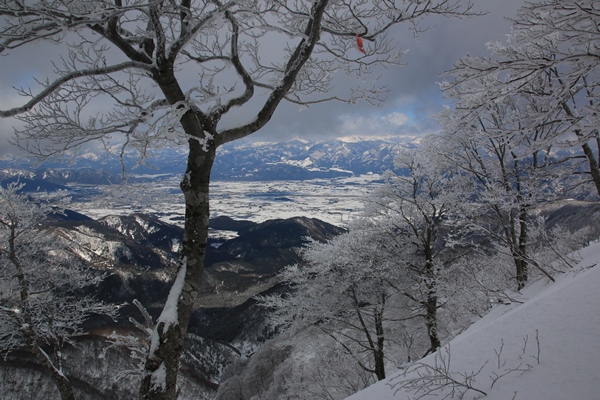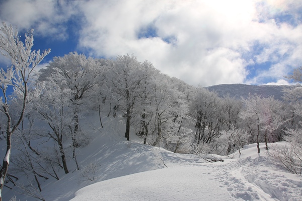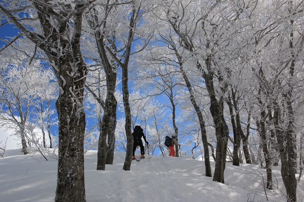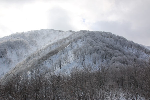 ■前山から先は樹氷を見物しながら登ります12月はここ前山で引き返しました。ここから先は初めて。少し下ってブナの急斜面。ブッシュがなければ良さそうな斜面ですが、ブッシュあり!ブナ斜面を登り切ると尾根っぽくなります。このへんの樹氷がキレイでした。で、この尾根の東側の谷は滑ると気持ちよさそう。下に堰堤が見えて、地図には林道もあります。ちなみに西側の谷はあまりそそられませんでした。 ニセピークを越えると、銀杏峯本峰までは無木立の稜線。風にたたかれたとこは雪が堅く、溜まったとこは柔らかい。少し下ってひと登りで山頂。車がたくさんだったわりに、人は少なくて山頂貸切。少し前に出た団体さんはニセピークの少し下で宴会してました。団体さん以外のお客さんはポツポツ程度ってことですね。