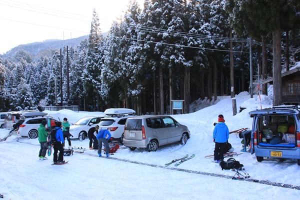 昨日は取立山に登り、そのあとは六呂師のコテージで宴会。遅くまで飲んで楽しみました。みなさま朝からシャキッと起き出し、予定通り7時にチェックアウト。銀杏峰の登山口になってる宝慶寺憩いの森へ。下の三差路で除雪は終わりかと思ったら、夏道登山口までは除雪してあり、駐車スペースも完備でした。雪が少ないからかな。その駐車スペースには8時で車たくさん!昨日の取立山は9時で誰もいなかったのに…。 ■登山口の宝慶寺いこいの村へ本日のメンバーは昨日からの引き続き6名と、日帰りでASC現役3名、合せて9名の大所帯。どうなりますやら…。銀杏峰には2ヶ月前の12月に下見に来ておりまして、前山まで登っています。一度来てる山は色んな意味で安心感があります。最初の取り付きをこの目で見てますんでね。その取り付きの斜面と前山直下の斜面が急なことは把握済。しかし、この雪の少なさは想像してなかったですね。難易度アップしてまう…。