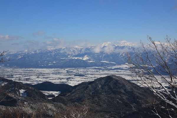 ■前山は展望良好の休憩所前山まで登り上げます。この直下は薮が濃くて急で、下りは苦労しそう。前山からは大野盆地と白山周辺の展望が素晴らしいです。ただ、少し下では見えていた白山が、雲に隠れちゃいました…。残念…。あと、昨日登った取立山が確認できました。何の特徴もない山に見えます。銀杏峰山頂は手前のピークに隠れて見えないけど、とりあえず雲はかかっていません。上空には雲があるので、ここらも晴れたり曇ったりのお天気となっております。
