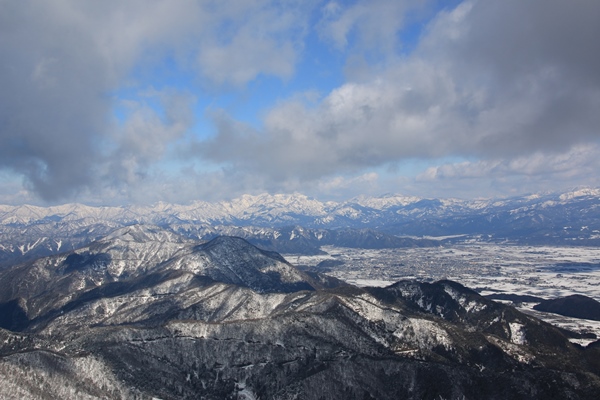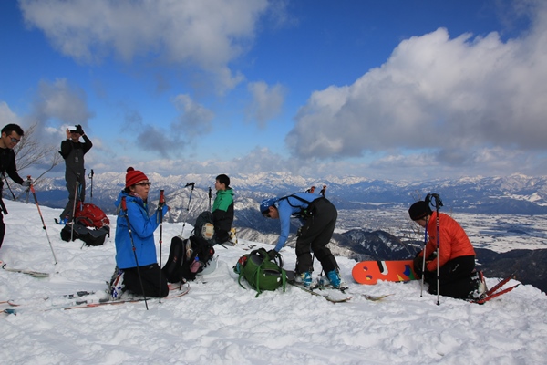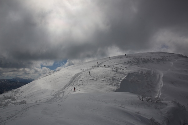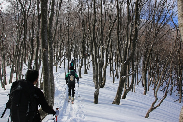 ■滑りは修行系でございます!シールをはずして修行タイムの始まり〜!山頂からの最初の滑りは意外と雪良くて楽しい!その先の尾根も、狭いけど雪が軽くて気持ちいい!ブナの急な斜面はブッシュが濃くなって、だんだんと不快指数が高くなってきます。急斜面になると、新雪の下の堅い層までスキーが届いてしまいます。でもまあ、特に問題なく降りてきて、スキーはずして少し登り返して前山へ。 核心と思われた前山直下の急斜面。斜面は急だけど横に広いので楽勝。拍子抜け…。下るにつれてブッシュは濃くなります。でも、斜面が急なところは横に広く、細い尾根のところは斜度がないため、それほど苦労することなく降りていけました。最後は杉林になります。日が当たらなくて、新雪が乗ってないのでカチカチでデコボコ。最後の急斜面はブッシュも濃くて苦労しました。全身運動。翌日筋肉痛に。ま、でも9人全員めでたく無事下山であります。 下山後は黒龍売ってる酒屋に立ち寄り、九頭龍温泉『平成の湯』で汗を流し、ここでみなさんと解散です。昨日の取立山と今日の銀杏峰、どちらも滑ったというよりも降りてきたという感じで、良い登山となりました。信州より西へ行く機会は少ないけど、機会を作ってまた来よう!