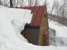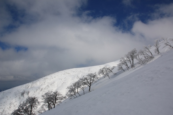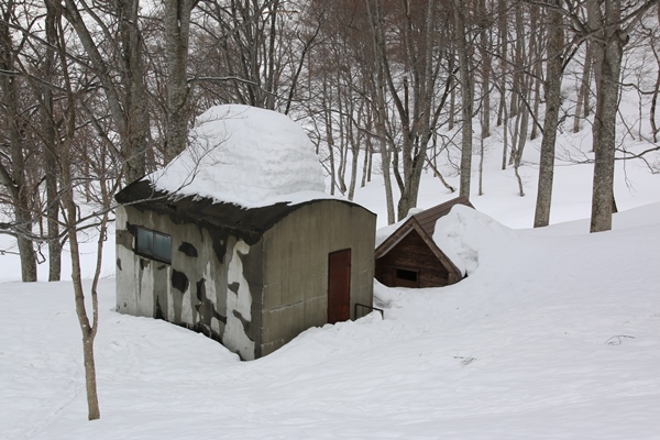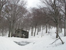 ■これから晴れてくるのかと思いきや、逆に雲が増えてきて・・・2007年の守門大岳も雪が少なかったです。4月1週目だったので単純に比較はできないけど、今年の現時点よりも2007年の方がずっと少なかったですね。今度はしっかり降った年に来てみたいです。出発時には晴れ間も出てていい感じだったのに、なんだかまた雲が増えてきました。長峰手前までは浅い沢形を進み、長峰からは緩い尾根を歩きます。このへん雪が少なくて困るようなことはなかったです。 緩い尾根を少し下った鞍部に保久礼小屋。ここで小休止。すっかり曇って、かいた汗が冷えて寒いくらいです。ここからが本格的な登り。本格的といいますか、手頃な斜度がコンスタントに続きます。シールでほぼ直登できるので効率もいいですね。シールの食い付きも良好。こんな登りはストレスもないし疲れない。そんなこともあってか、標高差約700mを休憩なしで一気登り。