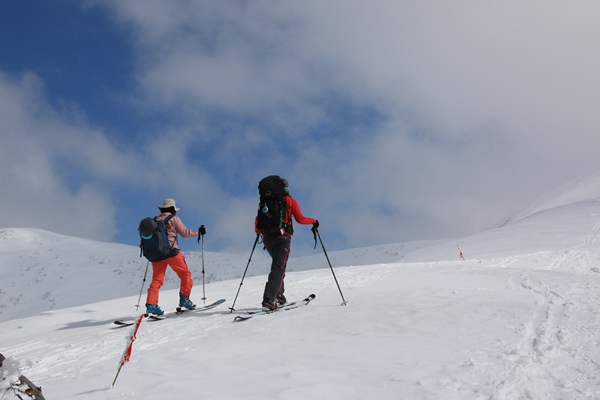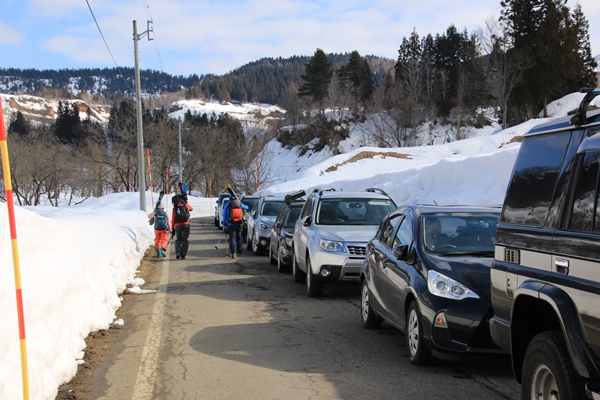 この週末は越後遠征。遠征ってほど遠くはないか…。守門大岳と阿寺山に登ってきました。どちらも標高差1000m以上あって、2日目の阿寺山が終わったあとはかなりお疲れモードとなりました。2日ともスッキリ晴れではなかったけど、まあまあのお天気。まきchin隊との合同山スキーということもあり、山に、山以外に楽しい週末を過ごしてきました。しかし、守門はまだしも阿寺山は雪少な過ぎ! 道の駅ゆのたにでまきchin隊と合流予定。4時に安曇野を出れば7時前には着くかな。ところがお腹の調子が芳しくなかったりでズレ込みます。二分の除雪終了点に着いたのは8時半頃になりました。既に路駐の車がズラズラと並んでいて、その最後尾に付けます。終点からは100mくらいはあったのかな…? ■二分の除雪終了点よりスタートです登山口あたりで雪壁は1mくらいですかね。場所によってバラつきはありますが・・・。例年に比べてどんだけ少ないかはわかりませんが、他のエリアに比べるとかなりマシに感じます。ここまで来る間に、栄村、津南、六日町…と豪雪地帯を通ってくるわけですが、六日町あたりの雪の少なさが目立ちました。湯沢なんて積雪ゼロですしね…。天気の方は現在くもり空。山頂は見えてます。予報は回復傾向なので期待しましょう! 9時前という遅めのスタート!おかげで前後に人がいません。大岳に登るのは2007年以来の9年ぶりとなります。ほとんど記憶にございません。今日は昨年も大岳に登ってるゴロ太君にお任せだ。ヘアピンのとこから長峰に直で登ろうとしますが、雪不足で厳しそう。ノーマルルートでいきます。ノーマルルートも歩きやすいし、地図を見る限り直ルートが近いわけでもないような…。