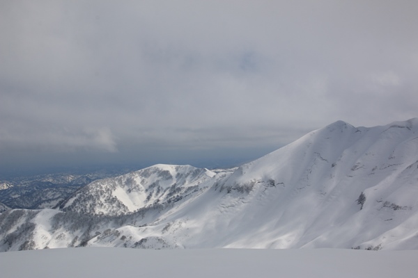 ■守門大岳山頂は賑わってます!山頂は賑やかでした。その中でひときわ賑やかな…raccoさんチームがいました。今回は3名様のようです。みんなで記念撮影です。空は曇りですが、近くの山の視界はなんとか確保されています。北にはまだ行ったことない粟ヶ岳。守門岳の山頂の左には3年前に行った守門黒姫と思われる山も。南西方向の立派な山は、はじめ最初越後三山あたりかと思ってたら違って、権現堂山の山並みでした。越後三山などは視界が悪いのか、雲がかかってるのか、見えませんでした。 予定では登った尾根を滑るつもりでした。…というか、なんにも考えてなかった。山頂手前を登ってる時、中津又岳から派生する北隣の尾根を滑る人が何名か。北隣の尾根を滑ると、保久礼小屋あたりで戻って来れるらしい。どんな尾根だかわかりませんが、少なくとも登ってる尾根より雪面はキレイだろうな…。登っている尾根はスキーのトレース、ツボの跡、滑った跡などでギタギタです。というわけで、まきchin隊もまだ行ったことのないという北隣の尾根を滑ることに。