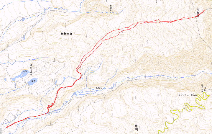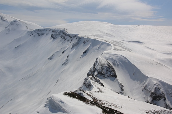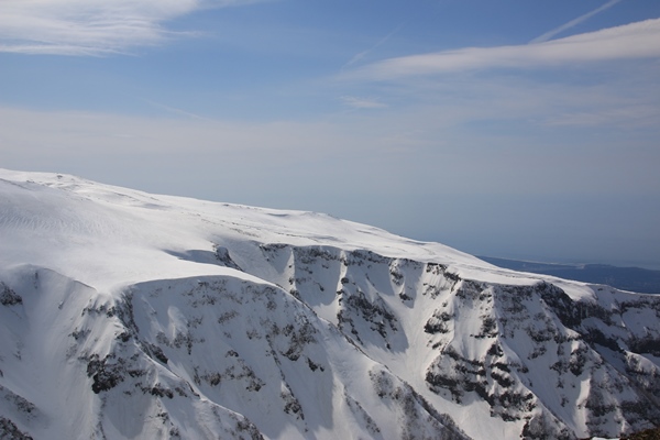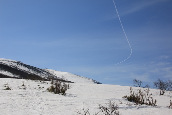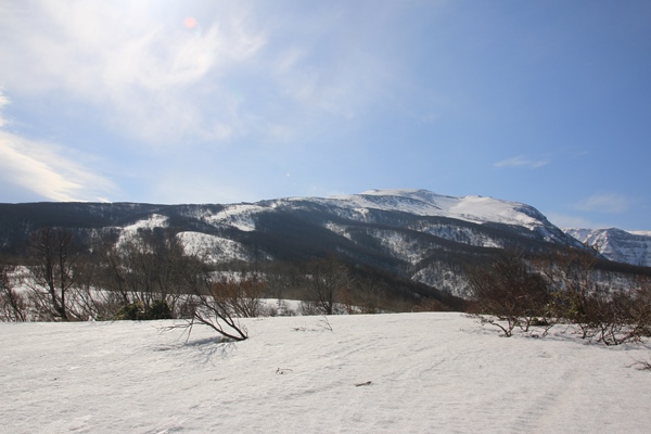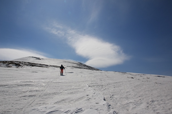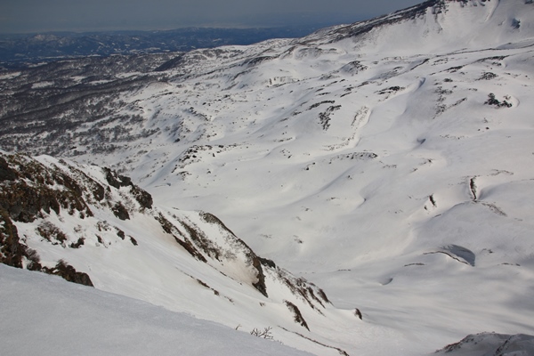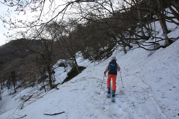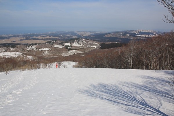 ■656m台地から本格的な稲倉岳北斜面七曲りの急坂から台地に登り上げると、ロケーションが良くなります。気持ちの良い広葉樹の林が広がっています。でも、雪が少ないんだろうなってのは一目瞭然です。普段だったら埋まってそうな、斜めに生えた木がたくさん雪から出ています。モジャモジャしててスッキリ感に欠けますね。しばらく道をたどると用水路のようなのが出てきます。それを渡って656mのポコへ。この登りは結構ブッシュがうるさかったです。 656mのポコに出ると、目指す稲倉岳とそこに続く斜面を一望できます。山頂の遠いこと遠いこと…。稲倉岳の北斜面は焼山の北面台地とか、浅草岳の早坂尾根を想像していました。実際に見てみると、そこまでキレイな滑り台ではなかったです。上半分はキレイ!やや白みがかってはいますが、今のところは晴れと言える空。明日にかけて下り坂とうことです。山頂に着くまで何とかこのレベルを保って欲しいものです。