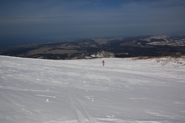 ■稲倉岳滑り台を滑ります!さて、滑りも期待できるかな?しばらくは滑っても滑っても景色が変わらない、真っ白な大斜面が続きます。まあ、登りも長かったですからね。概ね雪質は良好なんですが、時々シュカブラや段差が出てきて飛ばされます。海を見ながらの滑りがたまりません!ブナが出始める頃から雪が緩んで、雪面に吸い付かれるように。テレマークは前転注意報ですな。 若いブナの密林地帯は偶然にも回避。左隣の疎林の尾根に引き込まれました。動画を撮りながら降りたにもかかわらず、下りはやっぱり早いです。656mのポコで稲倉岳は見納め。あとは車道?に沿って降りるだけ。途中で1度、終点直前に1度板をはずして通過です。大斜面も楽しいけど、チマチマと障害物を避けながら滑るのも楽しいです。 ■稲倉岳から降りて・・・温泉は至近にある鶴泉荘へ。安くていいですね(300円)。夕食は酒田ラーメンへ。満月という店に行ってみました。酒田ラーメン=ワンタンメンなんですかね?この日は道の駅三川で車中泊です。 翌日土曜日は雨予報なので山はナシ。温泉とグルメかな…の前に、登山口偵察でもしておきましょう。北月山荘に向うも、あと4キロのところで除雪終わってました。この付近で2m弱の積雪があるので、他と比べるとかなり多いと感じました。そして大井沢へ。赤見堂の取り付き偵察です。車どこに止めるんだろう・・・?最後は畑集落へ。4月から開通予定が、雪が少ないためか既に開通していました。 そして河北町に移動し、まー君、まきchin隊と合流して名物の肉そばを食べます。今回はそば処あおばへ。このあと皆さんと別れ、下道でチンタラと岩手まで北上。今宵の宿は雫石の道の駅あねっこです。温泉もここで済ませました。夕食はコンビニで適当に・・・。以上、山を降りてからの覚え書きでした。