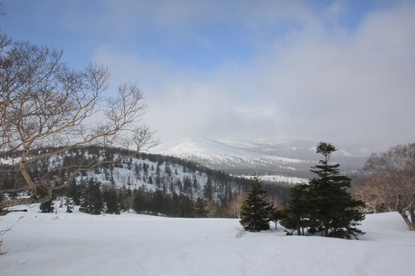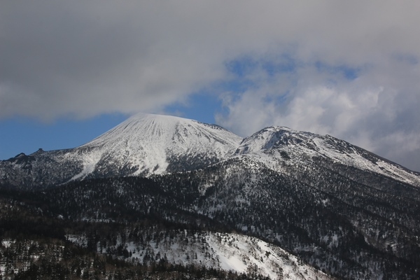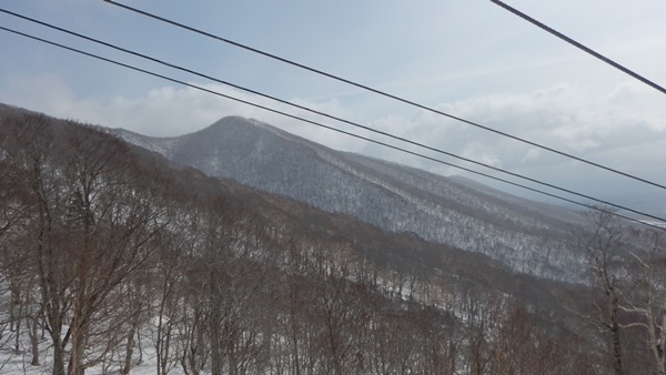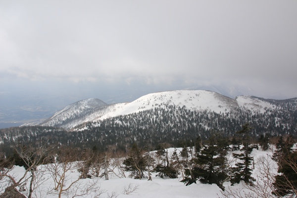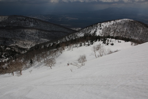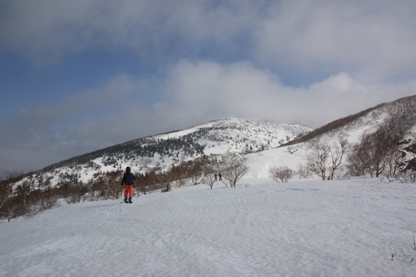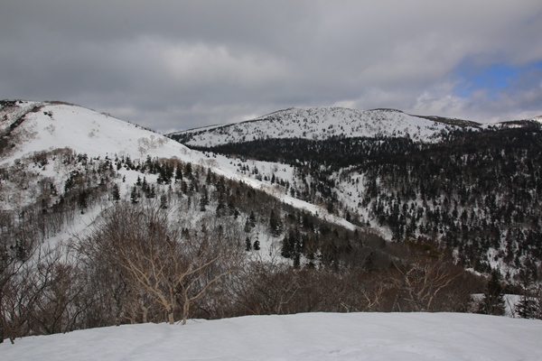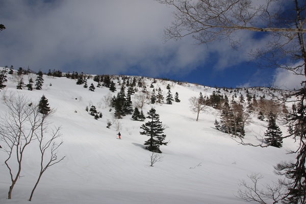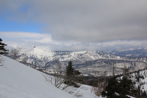 ■犬倉山の南東面には快適ザラメの斜面が!犬倉山山頂に登ると、岩手山が全部姿を現します。今日は見えると思ってなかっただけに感動!でも黒い…。真冬のビッシリ樹氷が着いてる時期に見えたら、ホントに感動もんなんだろうな…。西側の大松倉山には大きな真っ白な斜面があります。今度はそっちへ!今日の4つの倉コースは、今日辿ったコースはまあまあ楽しめます。ただ、これ以上範囲を広げても充実するとは思えない感じでした。 犬倉山から鎌倉森に向けて滑る斜面、適度な斜度のカンバの疎林斜面が続きます。雪も上質ザラメ!鎌倉森に登り返すので、少ししか滑りませんでした。鎌倉森へはどうせシール貼って登るんだから、いっそのこと谷底まで滑ればよかった…と後悔。余分に登るのはせいぜい100mくらいだったので…。次回があるかないかわからないけど、あれば是非谷底へ!コルから鎌倉森へは、少しだけどシール貼って登りました。 鎌倉森はスキーより歩きで来る人が多いのかな。網張温泉の下から登って来るようです。スキーの跡もあったけど、スノーシュー跡の方が圧倒的に多かったです。ツアーとかやってるのかも。滑ってみると確かに大変…。山頂からはまず雪庇の尾根。そのあとは若いブナの密林。適度な樹間になると雪が悪くなり、温泉に降り着いた時には疲れました。ゲレンデ滑った方が気持ち良かっただろうな…。まあ、でも一度は滑っておかないとね。あと、パウダーだったら良いかも。