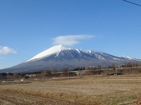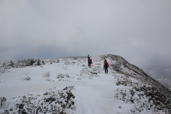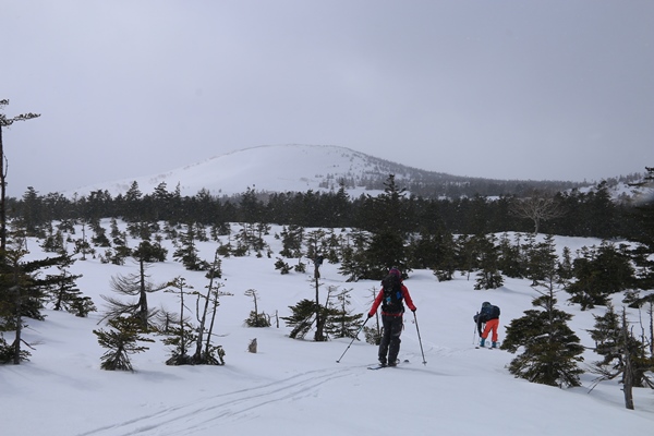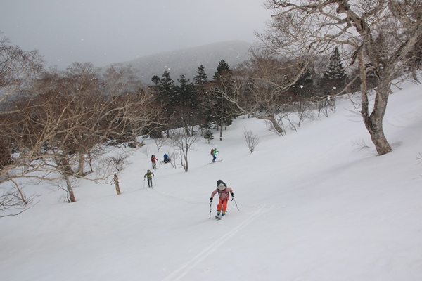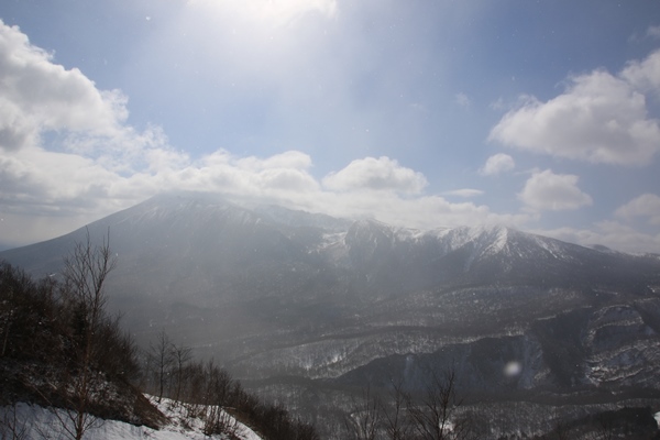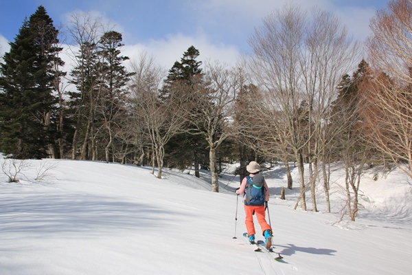 ■下倉山から中倉山へスタート時は快晴!ブナや針葉樹やその他、色々な木が混じった気持ちの良い林の中を進みます。昨日より冷え込んでて、雪はけっこう堅めです。進行方向はほぼ西で、南は崖、北は緩やかな斜面。崖の縁から岩手山が見えます。すでに岩手山には雲がかかっていました。このへんが悪くなるのも時間の問題かな。中倉山の付け根まではタラタラの尾根。 中倉山に向け徐々に斜度が増します。中倉山手前の本日一番の急斜面は、カチカチではないけどシールを食わせにくい雪。良い斜度なので、滑ると気持ちよいかも!このへんからかな…雪が降り始めてきました。やっぱりな…って感じ。晴れてる方が良いに決まってるけど、ここに降ってる雪は心地よく感じられました。