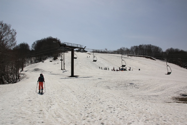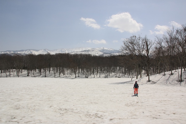 ■湯殿山スキー場を登り始めます早朝4時前に安曇野を出発。9時半過ぎに湯殿山スキー場へ。行程の短い山以外は前夜発ですな〜。天気は晴れだけど、空気はだいぶ霞んでます。南風が強いからかな。スキー場に着くと、えらい賑やか。営業は終わってるけど音楽が流れてて、地元のちびっこたちが練習していました。デポ車と思われる車は少なかったです。月山スキー場の営業は明日日曜日からだからかな。 まずはスキー場登り。正面は斜度があるので、左にある林道から取り付きます。全体的にかなり緩いスキー場ですな。あとほど緩くなるので、目指す品倉山はまだお目見えしません…。スキー場は元々は縦に2本あったと思われますが、上のゲレンデは現在はやってないです。