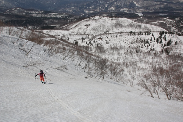 ■急斜面から始まって、あとはダラダラ・・・滑るルート取りは登ってきたままが良いと思われます。尾根を少し滑って降りて、登ってきた浅い沢に入ります。最初はちょっと急ですが、そのうち斜度は落ち着きます。ここは広くて平らで、樹間も適度に開いてます。雪質も締まり加減のザラメで滑るのにちょうどいい感じ。そんな極上斜面は100mちょっとでオシマイ…。 トラバース気味に夏道のラインに戻ります。夏道沿いは斜度もないし、雪も緩んで止まるようになり、半分歩いていた印象ですね。それでも下りベースだと早いです。あっという間に廃ゲレンデ上部に到着です。ここからはゲレンデを快適に…と思いきや、斜度がなくて圧雪してないので滑りません…。たま〜に出てくる斜度のある斜面で、一生懸命ターンしてました。そんなこんなでゲレンデベースへ。 湯殿山スキー場から品倉山は、急か緩いか両極端で、ちょうど良い斜度ってのがなかったです。楽しいのは楽しかったけど、メジャーなルートにはならないだろうな…と思いました。新雪が積もった時なんて、下りラッセル確実!急斜面はラッセル大変だし、雪崩もおっかなそう…。月山スキー場がオープンするこの時期に来るのが正解のようでした。 明日は月山から北月山荘に抜けるルートの予定。一緒に行くメンバーとは、道の駅三川で合流します。温泉は道の駅併設の田田(でんでん)へ。そして、同じく道の駅併設のスーパー『ラコス』で酒や惣菜を買い込み、夕食&宴会へと突入!今日も遅くまで飲んでしまいました…。しかし、道の駅にスーパーがあると便利!コンビニもあれば尚いいのに!