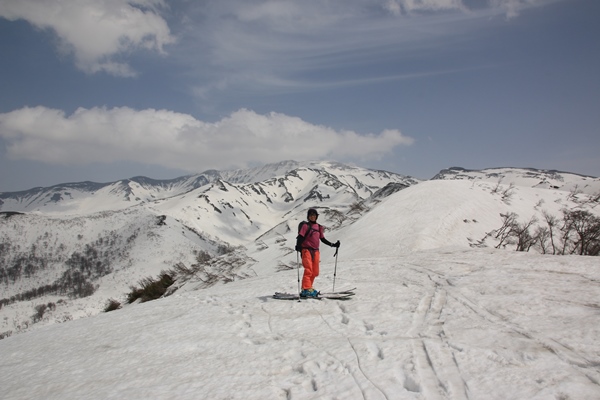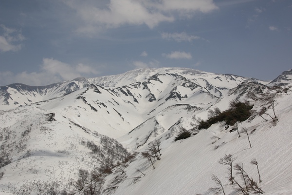 ■品倉山山頂は月山西面の様子がよくわかります尾根の斜度が徐々に緩んで、左に回り込んでいくと品倉山山頂。…と思ったら、三角点のある山頂はすぐ先のポコでした。これは家に帰ってから気付いたので、どうしようもないです…。でも、この先も登り加減でポコがたくさんあるので、山頂って感じじゃないですから。ヨシとしましょう。 品倉山からの展望ですが、一番目に付くのは湯殿山ですね。手前両側に薬師岳と仙人岳を従えて、荒々しく聳えております。この角度(北西)からの湯殿山はあまり見ないので、なかなか新鮮でございました。そして、左に目を移していくと、横広の月山本体。明日はあそこに行けるかな…?そしてそして、何より興味津々で眺めていたのが、北品倉尾根と呼ばれる尾根に広がる裾広がりの斜面。結構滑られているだけのことはありますね。とっても気持ちよさそうに見えます。来年行くべ!