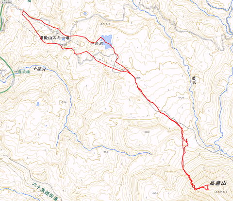 ■ダラダラと歩いて、最後に品倉山本体の急斜面に池から適当に登っていると、右手に木の生えてないとこが見えました。行ってみると今はやってないゲレンデ。地形図にはリフト載ってますが…。風情はないけど、登りやすいのでゲレンデを登っていきます。廃ゲレンデトップから先はさらに斜度が緩みます。ここでやっと品倉山が出現!結構立派な山じゃないですか! 樹林帯で雪が積もってるんですけど、なんとなく道があるってのはわかりますので、それを追いかけます。古いトレースの名残もありますね。まあ、どこをどう歩いても、品倉山の基部に吸い寄せられる地形です。最初は遥か先に見えた品倉山、どこを登ればいいのかなあ…とか思いながら歩いていると、いつの間にか基部に到着!品倉山本体の登りに備えて休んでおきます。 見るからに正面は急です。右のスカイラインが緩そうに見えますね。地図を見てもそんな感じ。ただ、どこを登っても、どこかで1ヶ所は急な部分があるようです。正面は避けて、一応右の尾根を登るつもりでトラバース。尾根に乗るとこがやっぱり急。ただ、雪は緩いので何とでもなる範囲の斜度です。 尾根に登るより、谷が登りやすそうに見えたので、まずは谷を登っていきます。斜度はあるけど雪面が平らなので登りやすい。登るほどに斜度が増し、限界のところで尾根に移動しました。尾根に乗っかるってみると、最初から尾根の方が登りやすかったみたい。まあ、最初から尾根登ってたら、滑るのも尾根だったでしょう。登った沢が唯一の極上斜面だったのでした。