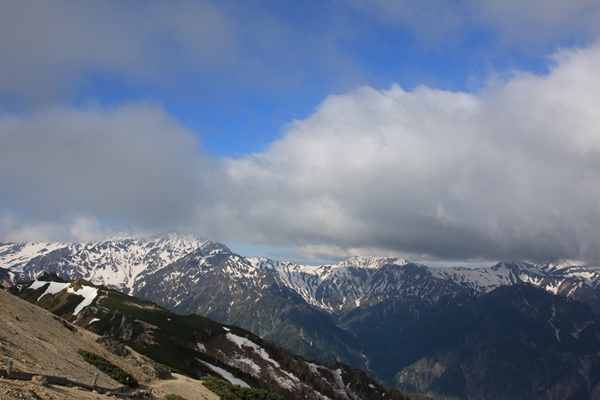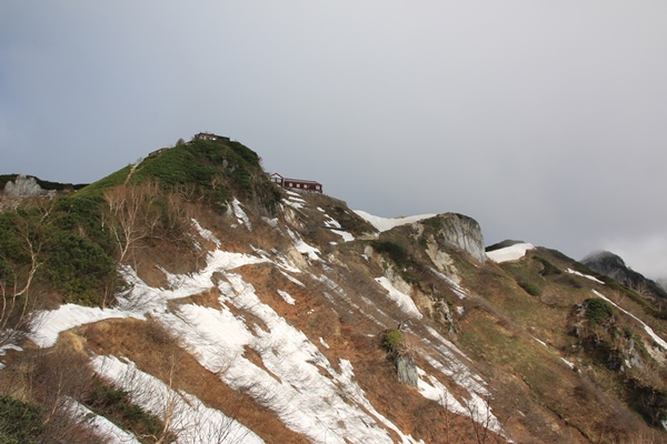 ■登り始めは晴れてたのに、まさかの・・・4時ごろにウチを出て、40分ほどで中房温泉へ。平日なので駐車場は余裕。ハイシーズンの土日の駐車場事情は、今どんな感じなんでしょうね・・・?車の温度計だと外の気温は3度。快晴でピリッとした空気の中を登り始めます。寒いので長袖着てましたが、すぐに暑くなって第一ベンチで半袖に。合戦尾根は第一、第二、第三、富士見、そして合戦小屋と適度な間隔でベンチがあります。どれもほぼ20分かかりました。 黙々と登るのは合戦小屋まで。ここからは雰囲気変わって、展望もよくなるんですけど、なんか雲が多いぞ・・・。途中まで雲ひとつなかったのに、稜線は雲に覆われ始めてます。そして、寒い!長袖に戻って、手袋も!雪もカチカチ!雪は2年前に比べると格段に少ないです。2年前は富士見ベンチの上から雪が出てきましたから。合戦沢の頭の登りも雪の直登だったし。トレランシューズみたいなので登ってるので、よく滑ること!