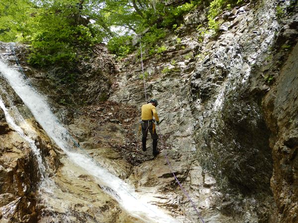 ■大滝でいろいろ練習しますしばらく進んだとこにある大滝(比較的大滝)が講習場。この滝を2回登って、水流の右を懸垂下降2回。色々と説明しながらやるんですが、自分の記憶を呼び起こすことが目的みたいなもんですな…。まあ、一石二鳥ということで!