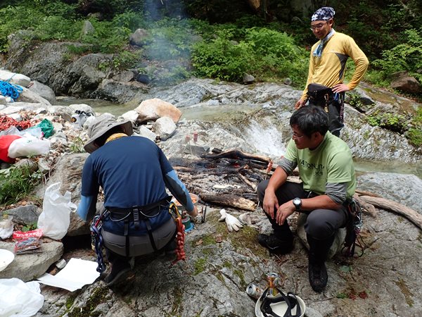 ■練習して楽しんだら下山して、次のお楽しみへ!暖かいと積極的に水に入るんですけど、基本的に水に入るのが好きでないワタクシは極力濡れずに下ります。最後のウォータースライダーの滝も滑らずに降ります。ちょっと滑って濡れたけど…。まきchin隊は楽しんでおりました。無事に大白沢は終了しましたが、次に沢登りをする予定はとくになく・・・。次の沢がまたここでないことを祈りつつ、今年の沢登りの無事を祈るところでございます。