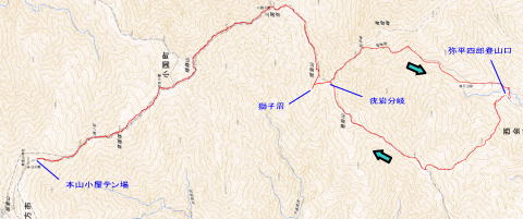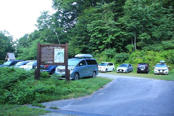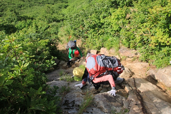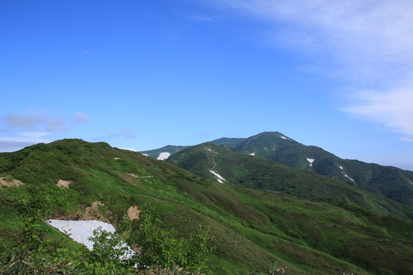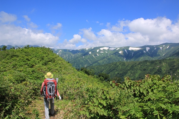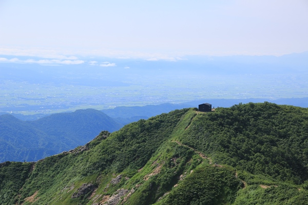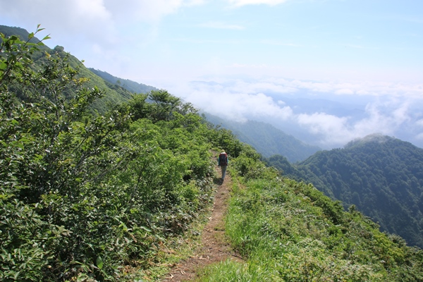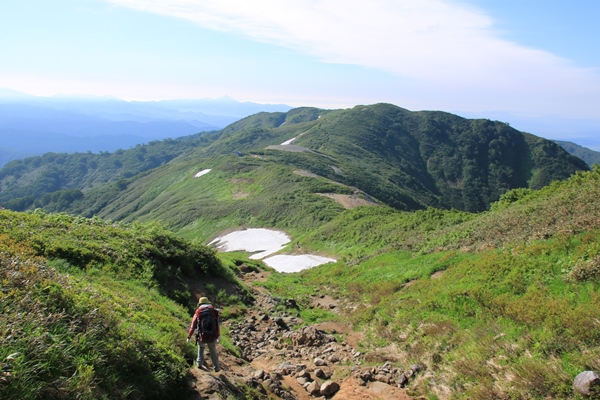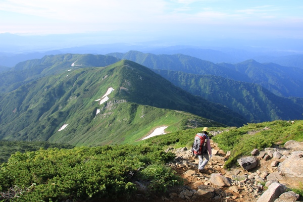 やっぱり飯豊は端から端まで縦走したいな…と思うも、思うだけで実行できずに時間だけが経過。2008年に飯豊山荘から周遊したのが初飯豊でありました。飯豊は『足』の部分がネックになりますね…。車回すのも大変だし、公共交通機関使うのも大変。仕方ないので細切れ作戦ですね。2008年では門内岳から飯豊本山をトレースしているので、今回は飯豊本山以南をトレース。残るは門内岳以北だ! ■1日目 弥平四郎登山口から本山小屋飯豊本山以南といっても、大日杉、川入、弥平四郎…と主に3つの登山口があります。このさき大日杉から登る予定がなきにしもあらずなので、今回は弥平四郎登山口から登ることに。我が家から飯豊は微妙な距離。初日の行程も長いので早朝初は難しく、どうしても前夜初となります。阿賀野川SAで仮眠。4時に起きて、5時半ごろに弥平四郎登山口に到着です。広場になってる駐車場はすでに満車ですが、近くの林道の広くなってるとこに駐車です。 ■弥平四郎登山口から登りは新ルートで登山口の標高は680mと低いんですが、飯豊の中では高いほう。2コースありますが、登りは尾根ルートを選択。いきなりブナの急登。暑さは覚悟してましたが、朝はわりと涼しめでした。北の高気圧に覆われているからかな。予定は信州の山だったけど、信州の予報が良くなかったので、飯豊まで追いやられてきました。その甲斐あって、今のところ澄んだ青空が広がっております。 上ノ越で稜線に出ます。今までブナで涼しかったけど、ここからは灌木の尾根歩き。途端に暑くなります。直射日光は浴びるし、灌木に熱はこもってるし…。左側の灌木の隙間からは大日岳から飯豊本山にかけての稜線が見えています。でも、なんだか雲がかかり始めてるようです。このあたりの稜線もだんだん怪しくなってきて、三国岳に着くころにはすっかり雲に覆われてしまいました。