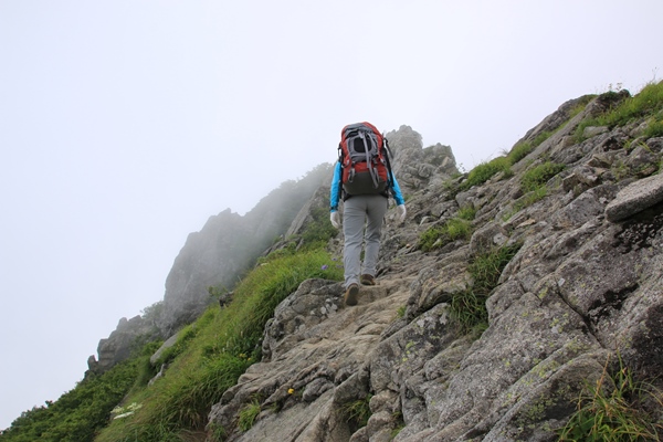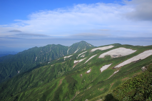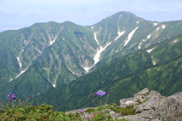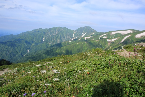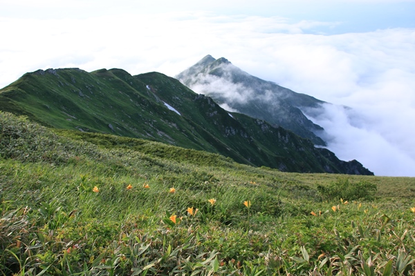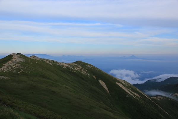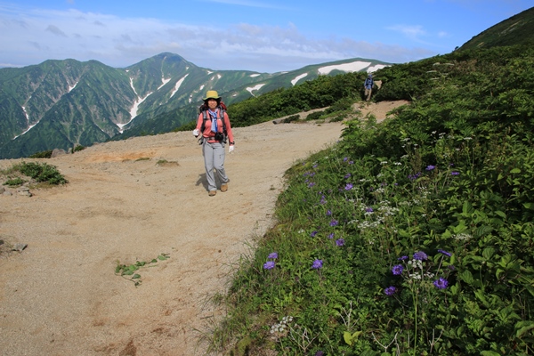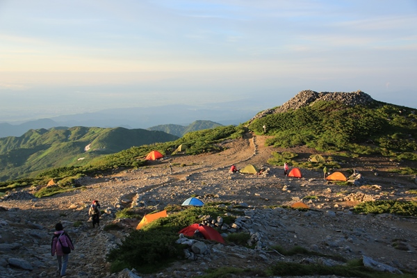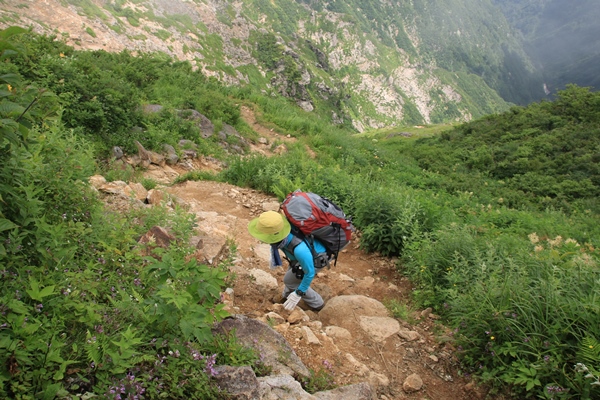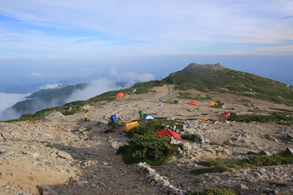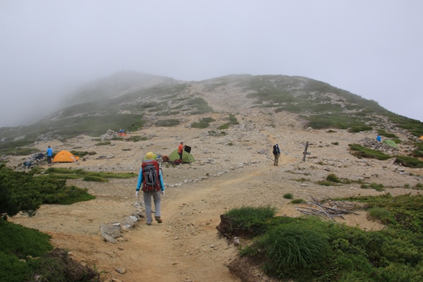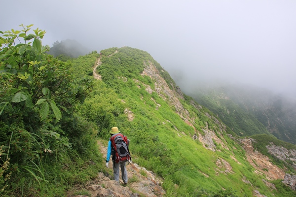 ■本山小屋のテン場を後にしますあとは昨日歩いてきた道を戻るのみ。でも新鮮!昨日はほとんど視界ない中を歩いてきました。今日は晴れているので展望を楽しみながら歩きます。昨日は花を、今日は展望を…って感じですかね。欲を言えば逆のほうがよかったかな。昨日が展望で今日が花。最後に歯を食いしばりながら登った坂は、あっけなく下ってしまいます。