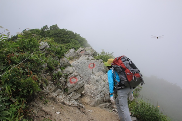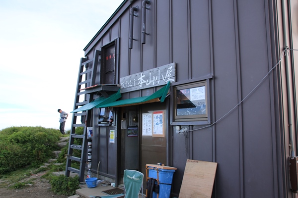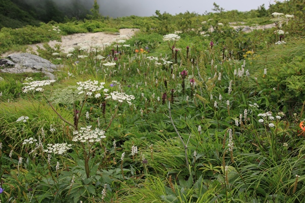 ■三国小屋あたりから雲が沸いてきて・・・三国小屋のおじさんの話では、切合小屋が一番混むとのこと。当初は切合小屋にテントを張って、初日か翌日の天気の良い方で本山を往復するつもりでした。混むと聞くと、本山小屋まで行くのもありか…と思うように。ここまであまり人に会わなかったけど、三国岳で川入からの道と合わさります。それでも人が増えた実感はなし。ガスガスで展望はない代わりに、花は少しずつ多くなってきました。 切合小屋で大日杉の道と合流します。人が増えた実感がありました。テン場をのぞくと6張りくらい。まだまだ余裕だったけど、今の天気だと今日の飯豊本山往復はないなあ…。切合小屋のロケーションもイマイチだし、まだお昼だし、これは本山小屋まで行くしかないですな。夕方になって晴れれば、本山まで行くのも楽。朝日も見に行けるし。