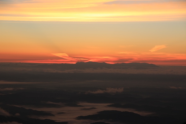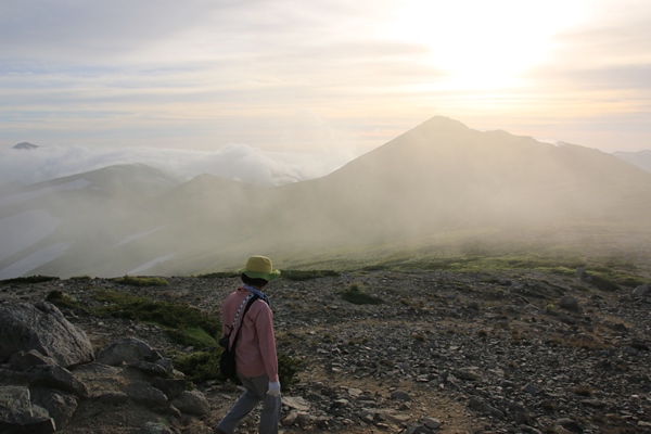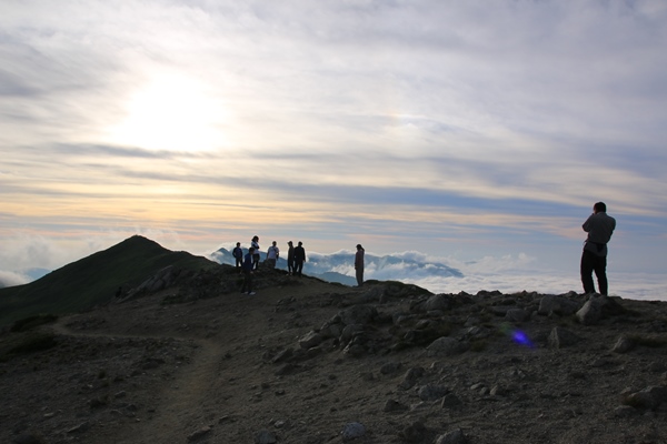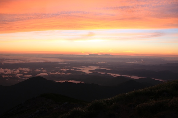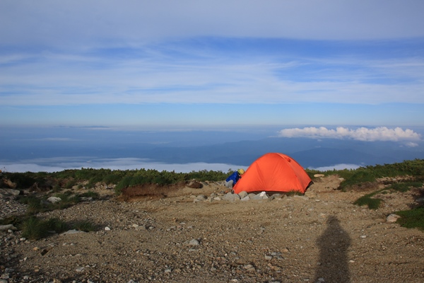 ■2日目 本山小屋から弥平四郎登山口■日の出を見に飯豊本山へ朝4時に目を覚まします。すでに明るくなり始めています。フライシートが赤いので元々テント内は赤いんですが、朝焼けの赤が加わってより赤に。テントから外を覗いてみると、太陽はまだしばらく出てこない感じ。飯豊本山に向かいます。どこで太陽が出てくるかなあ…。本山小屋のトイレに寄ります。2つしかないので結構な待ち時間。太陽が出てしまう〜 本山小屋から飯豊本山へは西よりに向かいます。なので、振り返りながら日の出の様子を確認。コルから少しのところで出ました!あと少しで本山だったのに…。トイレ渋滞がなければ本山で見れたかな。下界は薄い雲海、空も薄い雲が広がってて、かなりキレイな日の出ショーでありました。言葉では表現難しいので写真にて…