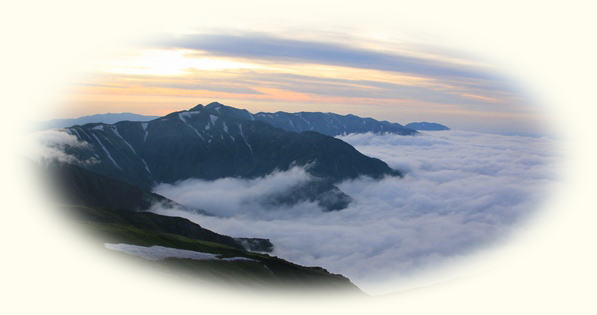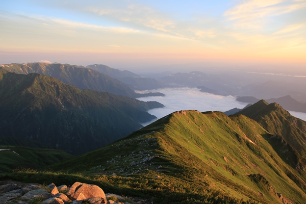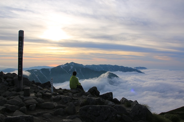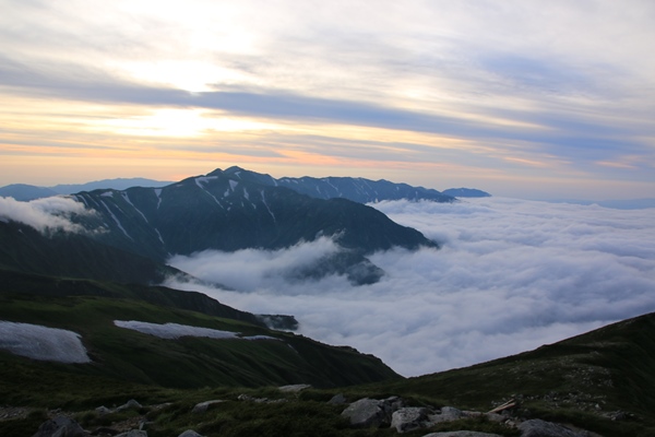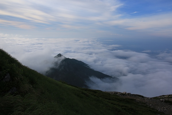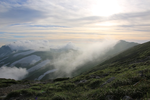 ■夕方になって晴れてきたので飯豊本山へテン場は広くてロケーションよし!荒れれば大変だけど…。今日は大丈夫でしょう。先客は10張り弱。荷物背負う時間は長くなるけど、テントで泊まるなら本山小屋まで来るべきでしょうな。ビールが旨い!着いて1本!テント張りながら1本!つまみ食べながら1本!外にマット敷いてウトウト…。晴れたら飯豊本山に行くつもりにしてるけど、なかなか晴れてこないなあ… 5時過ぎになって東側の雲がなくなってきました。せっかくなので本山へ。稜線にはまだ残り雲があって、逆にそれがいい感じになっていました。下界は完全に雲海の底に沈んでます。今日は稜線がガスガスで残念だったけど、夕方のこの景色で完全に挽回できました。日没までには時間があったので、テン場に戻ります。