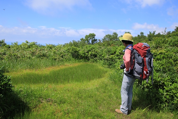 ■帰りは獅子沼に立ち寄ってみますきのうは9時ごろから雲が沸き始めました。今日は9時になっても雲が出る気配なし…。暑いのでそろそろ曇ってくれても…。それでも最後のスポットであります獅子沼までは展望あって欲しいな。疣岩山への登りが最後の本格的な登りですが、これがかなりキツかった…。獅子沼へは疣岩山の先で少し寄り道する格好。きちんと刈り払いされてたので行ってみると、干上がった小さな池塘が一つあるだけ…。灌木に阻まれて展望もなし…。ちょっと騙された感があったけど、寄り道はちょっとだけだったので良かったです。これが遠かったらショックでかい!