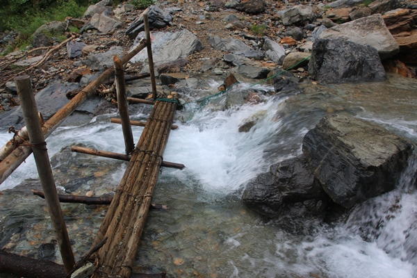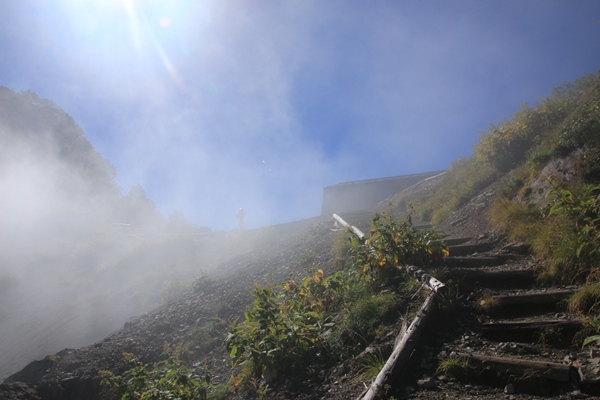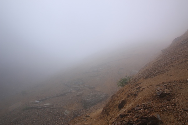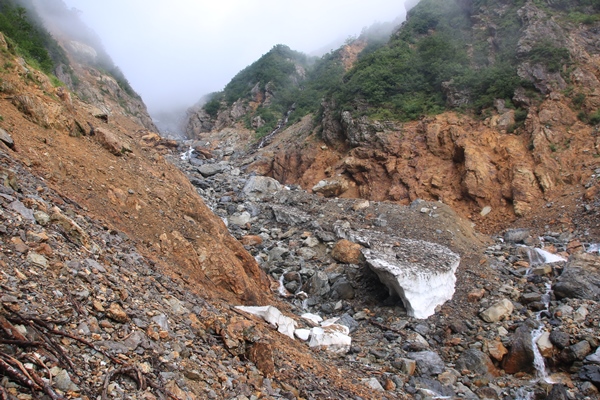 ■針ノ木雪渓にはほとんど雪ナシ・・・かわりに雲が大沢小屋から登山道に戻ります。雪がたくさん残っていれば、この先で雪渓歩きになると思われますが、見えてる範囲に雪は見えません。なので初っ端から秋道。高巻き道になるので道は微妙だし、アップダウンも出てきます。針ノ木雪渓や白馬大雪渓なんかは雪渓の上を歩けてナンボですから。 左岸から右岸、右岸から左岸…と渡渉を繰り返しながら登っていきます。雪はノドの部分に残骸がわずかにあるだけでした。もう、かれこれ標高2000mくらいになるけど、雲の上に出る気配がありません。雲海ってだいたい2000mくらいで抜けることが多いけど、今日の雲海は分厚いんでしょうか…