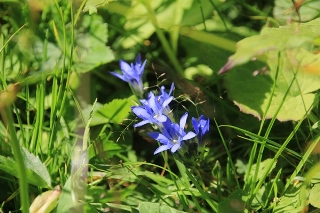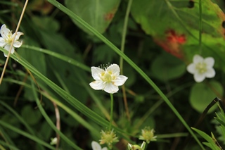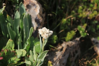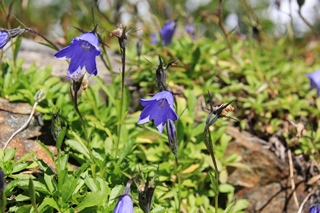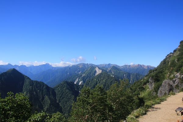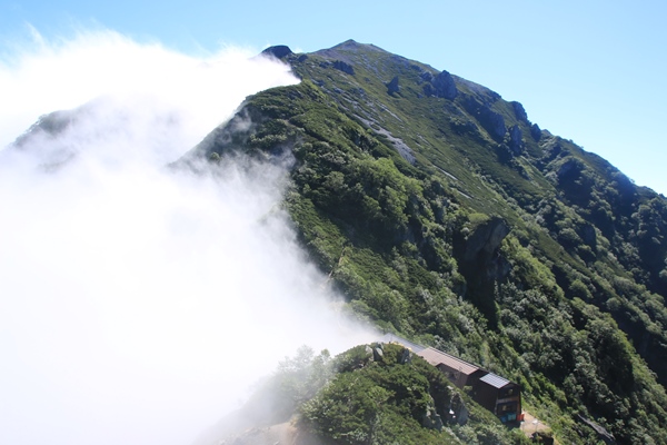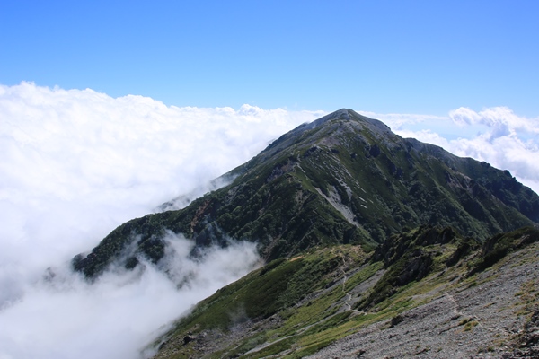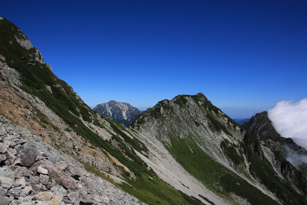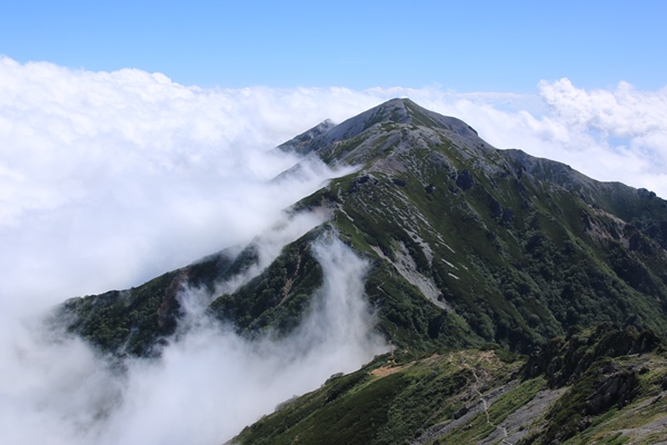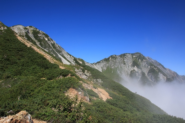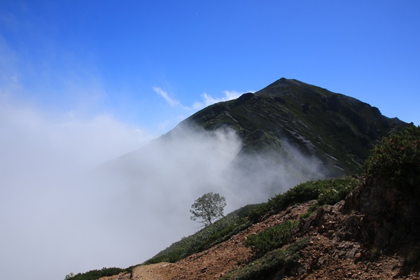 ■針ノ木峠からやっと晴天に雲海を抜けたのは、針ノ木峠に出てからでした。針ノ木雪渓を沸き上がる雲が、稜線の反対側からの風に戻される感じ。稜線の北側は分厚い雲海、南側は雲一つない快晴になっていました。目指す針ノ木岳はしっかり出ています。空は台風一過らしく真っ青。やっと気分よく歩くことができます。遅くまで雪が残っていたであろう場所には、まだ夏の花も咲いていました。