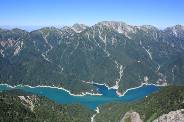 ■針ノ木岳山頂は展望すこぶる良好です!針ノ木岳山頂は眺めよかったです。一番のアングルは黒部湖と立山&剱岳でしょうね。先々週に登った御山谷もよく見えます。立山や五色ヶ原の東面の谷には、この時期まだ雪渓がビッシリだと思うんですが、今年は全く見当たりません。まあ、針ノ木雪渓もこんな状態ですからね。西側と南側はしっかり展望あったのですが、北と東は微妙。針ノ木雪渓や扇沢を埋める雲海の雲が分厚くて、赤沢岳以北の展望を隠してしまっています。おかげで爺ヶ岳や鹿島槍、白馬方面の山々は見ることができませんでした。