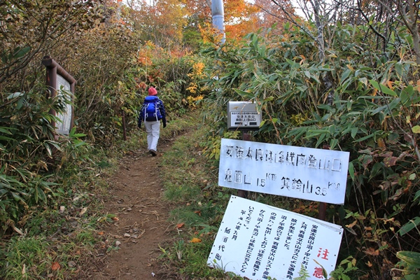 横向温泉に向かうと紅葉がいい感じに。登山口より上は終わりかけといったところです。箕輪山の西側から登るので、朝はどうしても日陰に。ブナの黄葉が日陰ではつまらんので、先に旧土湯峠経由で登ります。帰りの日の当たる時間にブナの良さそうなところを通ろうという目論見でした。