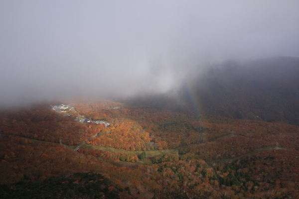 ガスガスの鬼面山山頂で写真だけ撮ってすぐに引き返します。降りていくと、少しずつ雲は薄くなりましたが、高いところにはまだ雲がベッタリ。旧土湯峠からの下りでは、また日も差すように…。そして、なんと箕輪山の山頂も出現!ま、山頂はまた雲で隠れたけど…。もし登ってたら晴れてたかもな…と多少の未練を残しながらも横向温泉に下山。また来よう!
