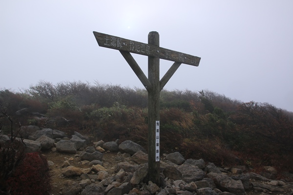 旧土湯峠から少し鬼面山の方に登ると、とうとう雲の中に突入!テンション急降下…。霧もどんどん濃くなり、とうとう霧雨もパラパラと。どうしましょ…?ここで引き返すかとも考えたけど、鬼面山まではもうひと登り。鬼面山まで登っておいたら、なんか一応山に登ったことになるな…ということで、鬼面山まで頑張ることにしました。