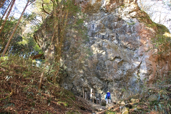 登山道に入ると道沿いに単線の軌道あり。奥にはワサビ田が何ヶ所かあったけど、その運搬用なのかな?沢沿いを詰めます。何度か沢を渡るけど、立派な橋が架かってました。水量に対して立派過ぎるような…。2回目の渡渉のところに大岩あり。エアリアのチェックポイントにもなってます。『大岩』でわかるのかなあ…と思ってましたが、ホントに大岩でした。『大岩』の道標もあり。しばらくで沢を離れ、斜面を登っていくと蓬峠。蓬峠にはベンチがあってお休み処となっております。