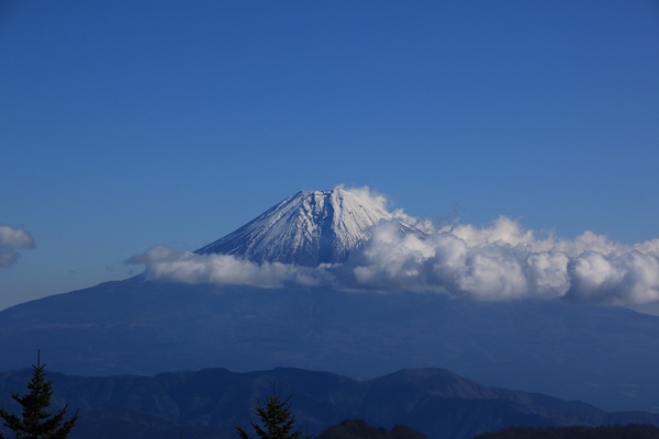 稜線の道に合流です。少し雪が増えました。…といっても、1~2センチですけど。しかし、靴がお粗末なので気を遣います。靴の甲の部分に雪が付くとしみ込んでくるので、すぐに落とさないと濡れる…。少し山伏側に進むと笹原に。ず~っと樹林帯で展望なかったのでスカッとした気分に!右側が開けたところから富士山も!先週に引き続き、今週も富士山見れました!