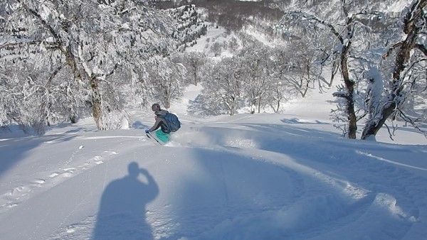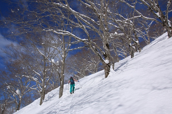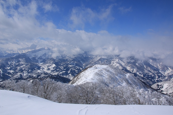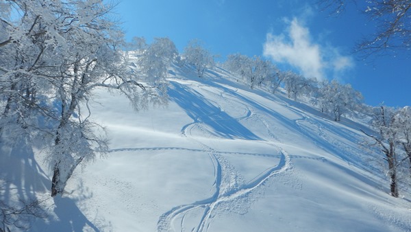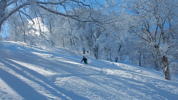 今のところ晴れてるけど、いつまで続くかわからないので無難に北斜面を周回することにしました。最初の一段は急斜面だけど、徐々に斜度が緩んでテレマーク向きの斜面に。ブナに樹氷がビッシリ着いててキレイです。雪は一昨日のものと思われますが、ほぼ降ったままの状態で保存されていました。なかなか軽いパウダーです。